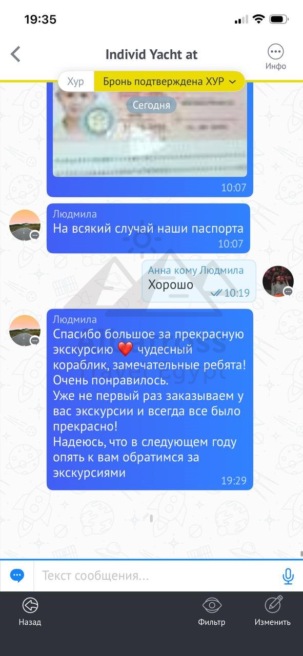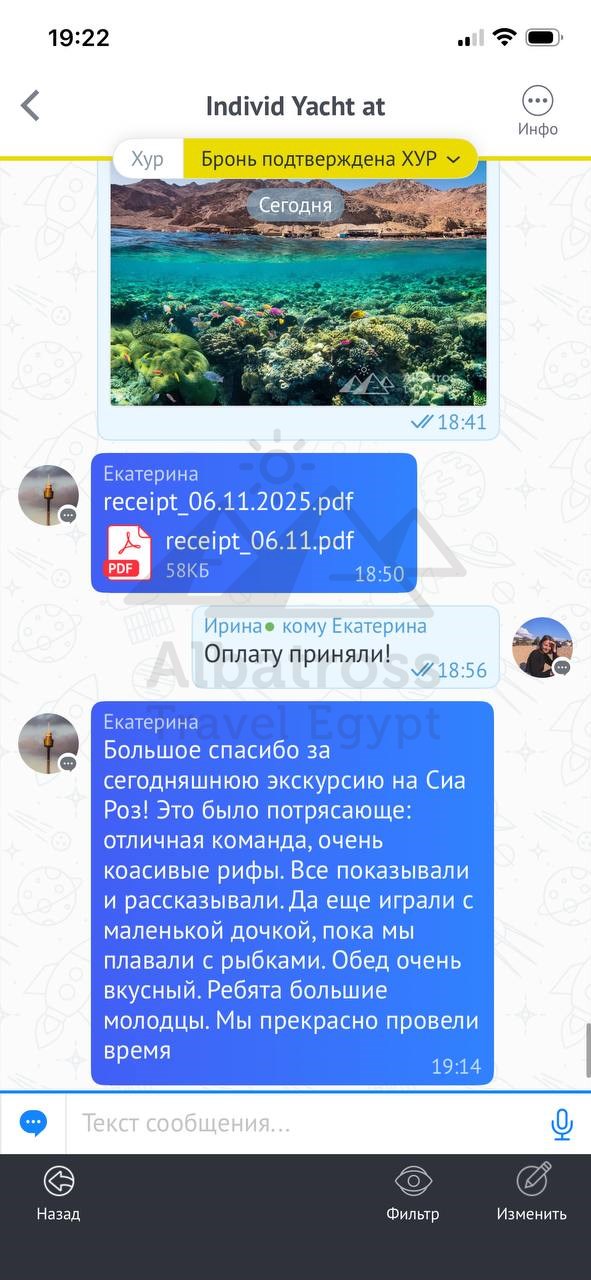 Хотим выразить благодарность за аренду яхты в Хургаде. С отеля забрали вовремя, сразу же сели на яхту с цивилизованного причала, команда сразу предложила напитки, пока разложились уже вышли в море. Яхта Мираж красивая, чистая, одно удовольствие! Поехали на пляж Оранж на Гифтуне, там были 2 часа, потом обед вкуснейший, просто молодцы ребята, потом снорклинг, поплавали с рыбками. Капитан Махмуд профессионал, вся команда молодцы, фотограф Хвалит нас везде сопровождал, показывал, помогал! Нас было 2 семьи, все впечатлены и очень довольны. По прибытии нас уже ждал трансфер, нигде не пришлось никого ждать , сделали кучу красивых фото, в следующий приезд обязательно возьмем яхту еще раз. Команда яхты Мираж и Альбатрос тревел — рекомендую!