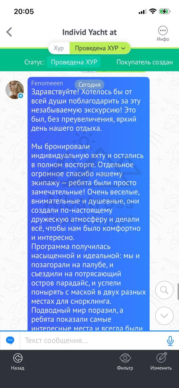 Мы бронировали индивидуальную яхту и остались в полном восторге. Отдельное огромное спасибо нашему экипажу — ребята были просто замечательные! Очень веселые, внимательные и душевные, они создали по-настоящему дружескую атмосферу и делали всё, чтобы нам было комфортно и интересно.