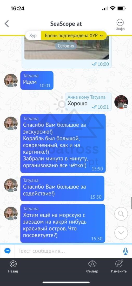 Добрый день! Большое спасибо за сегодняшнюю поездку! Мы очень довольны! Организационная работа и сама поездка на батискафе очень понравились