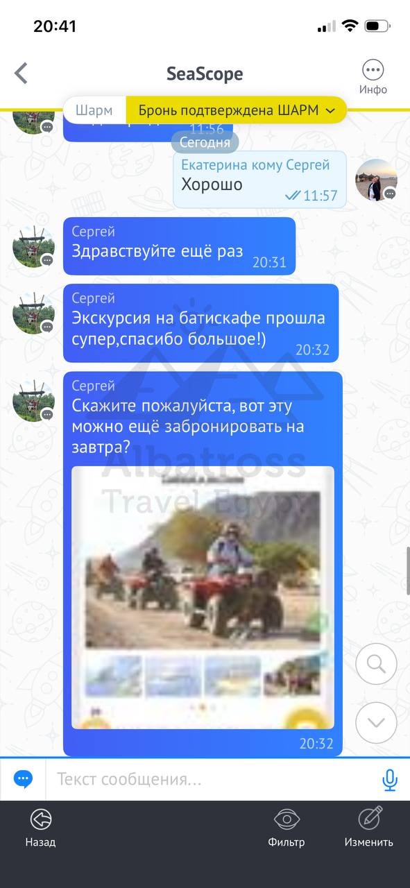 Добрый день! Экскурсия на отлично, красивое море, риф и рыбок много. Экскурсия намного дешевле чем у остальных. Спасибо вам большое!
