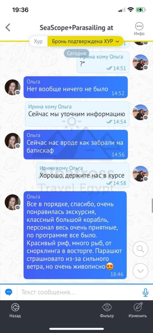 Все в порядке, спасибо, очень понравилась экскурсия, классный большой корабль, персонал весь очень приятные, по программе все было. Красивый риф, много рыб, от снорклинга в восторге. Парашют страшновато из-за сильного ветра, но очень живописно