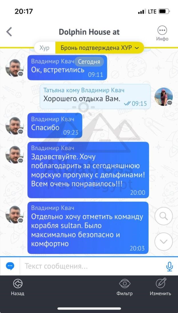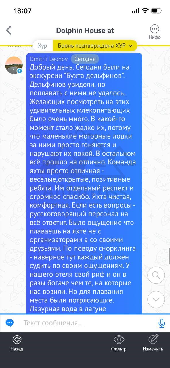 Добрый день. Сегодня были на экскурсии «Бухта дельфинов». Дельфинов увидели, но поплавать с ними не удалось. Желающих посмотреть на этих удивительных млекопитающих было очень много. В какой-то момент стало жалко их, потому что маленькие моторные лодки за ними просто гоняются и нарушают их покой. В остальном всё прошло на отлично. Команда яхты просто отличная — весёлые,открытые, позитивные ребята. Им отдельный респект и огромное спасибо. Яхта чистая, комфортная. Если есть вопросы — русскоговорящий персонал на всё ответит. Было ощущение что плаваешь на яхте не с организаторами а со своими друзьями. По поводу снорклинга — наверное тут каждый должен судить по своим ощущениям. У нашего отеля свой риф и он в разы богаче чем те, на которые нас возили. Но для плавания места были потрясающие. Лазурная вода в лагуне окружённая рифом. Просто супер. Не смотря на все ньюансы ставлю 10 из 10. Спасибо Альбатрос тревел за данную морскую прогулку.