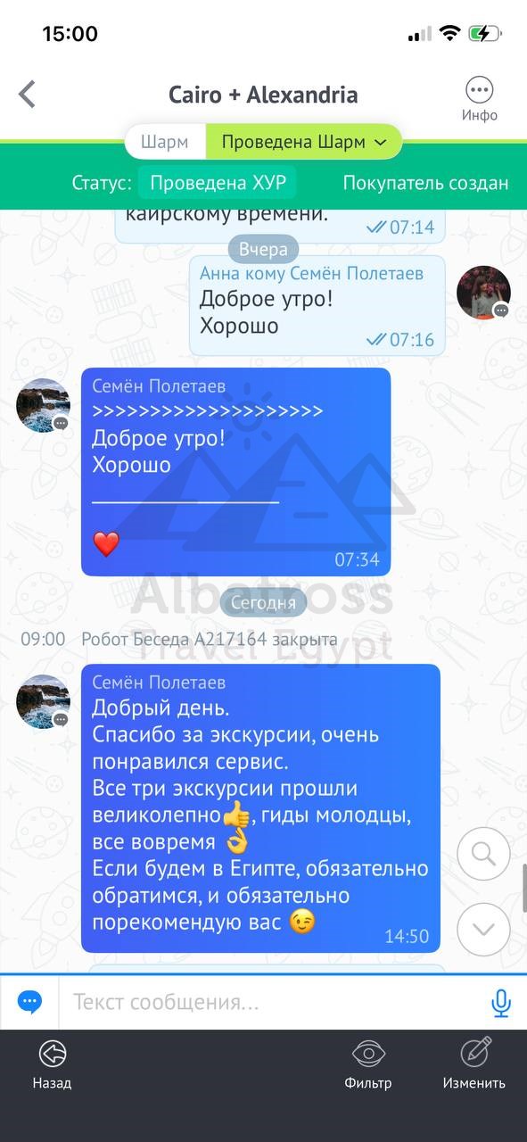 Добрый день! Поездка в Каир и Александрию прошла хорошо. Сопровождающие молодцы — решали все вопросы! Особенно тот кто был с нами в Александрие, ему отдельный респект! Гид в Каире был красавчик — позитивный, хорошая подача информации и всегда готов помочь! Спасибо вам за организацию путешествия!!