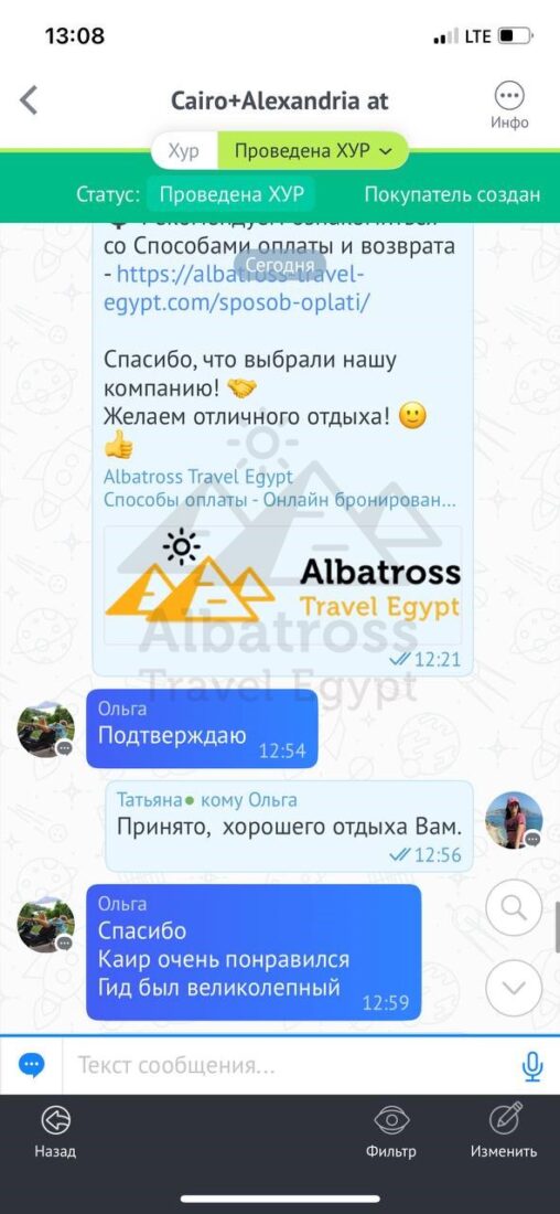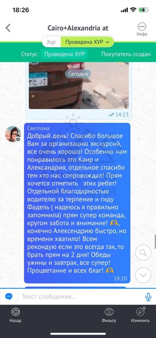 Добрый день! Огромная Вам благодарность за организацию экскурсий, было всё супер, мы очень довольны!!! Отдельная благодарность нашим гиду и водителю, они самые лучшие( гид провёл везде нас самыми первыми, акценты делал на самом интересном, сфотографировал нас на самых удачных локациях, историю и традиции рассказывал очень интересно, ответил на множество наших вопросов, водитель просто большой души человек, выполнил наши просьбы: свозил в Государственную аптеку, купил нам лекарства и манго на свои деньги, когда у нас не прошёл платёж по карте, во время пути покупал еду нашему ребёнку и общался с нами на английском очень активно, мы обменялись опытом и информацией очень весело и плодотворно, многое узнали о Египте и людях. Мы очень высокого мнения о всех людях, с которыми мы контактировали во время поездки: даже владельцы гостиницы в Каире большие молодцы, очень старались, что бы нам было комфортно), будем рекомендовать Ваш сервис. Отдых с Вами получился незабываемым, мы увезем в Россию восхитительные эмоции и воспоминания. И ещё мы поняли, что люди в Египте очень добрые, открытые и позитивные. Спасибо большое Вам. Если Ваш сервис будет доступен в других странах, обязательно воспользуемся❤️👍🙏💋💋💋
