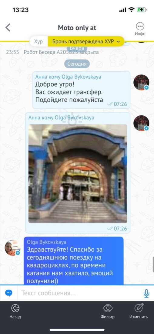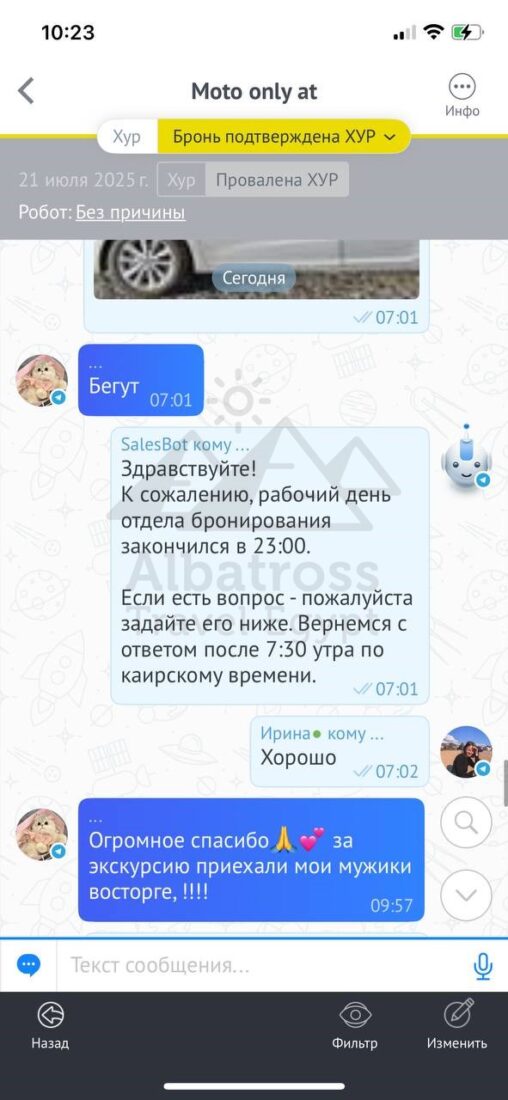 Мы также хотели бы обратить ваше внимание, что для оперативного решения любых вопросов, возникающих непосредственно во время экскурсии, менеджеры нашего сервиса доступны для связи с 7:30 до 23:00. В случае ночных выездов мы всегда предоставляем контакт дежурного сотрудника. К сожалению, мы не получили от вас сообщений в ходе поездки, и у нас не было возможности помочь Вам и повлиять на ситуацию в реальном времени.