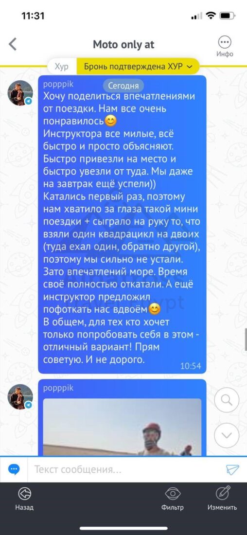 Мы сегодня ездили на квадроциклах, хотела бы сказать вам большое спасибо за прекрасную организацию. Все четко, понятно, прекрасно организовано. От индивидуальной поездки остались очень довольны. Обязательно будем вас рекомендовать друзьям)