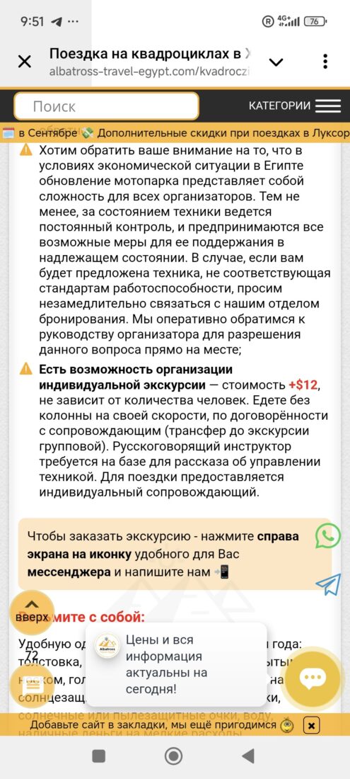 Здравствуйте. Едем с данной экскурсии. Нарисовали себе картинку, которая не оправдала ожиданий. К сожалению, наша индивидуалка не оказалась той о чем написано в скрине (нас 4взр). Никто о скорости с нами не договорился. Катились одной колонной 10 км/час. ШТО? (Ни что… Што). Начинали ускоряться, останавливали нас и стояли по 10 минут штрафа. Серьезно из 45 мин. Так об этом нужно было на инструктажа сообщить! Ластами (не руками) своими перед моим лицом не надо размахивать. В общем, где экстрим? Видимо в его размахивании руками.