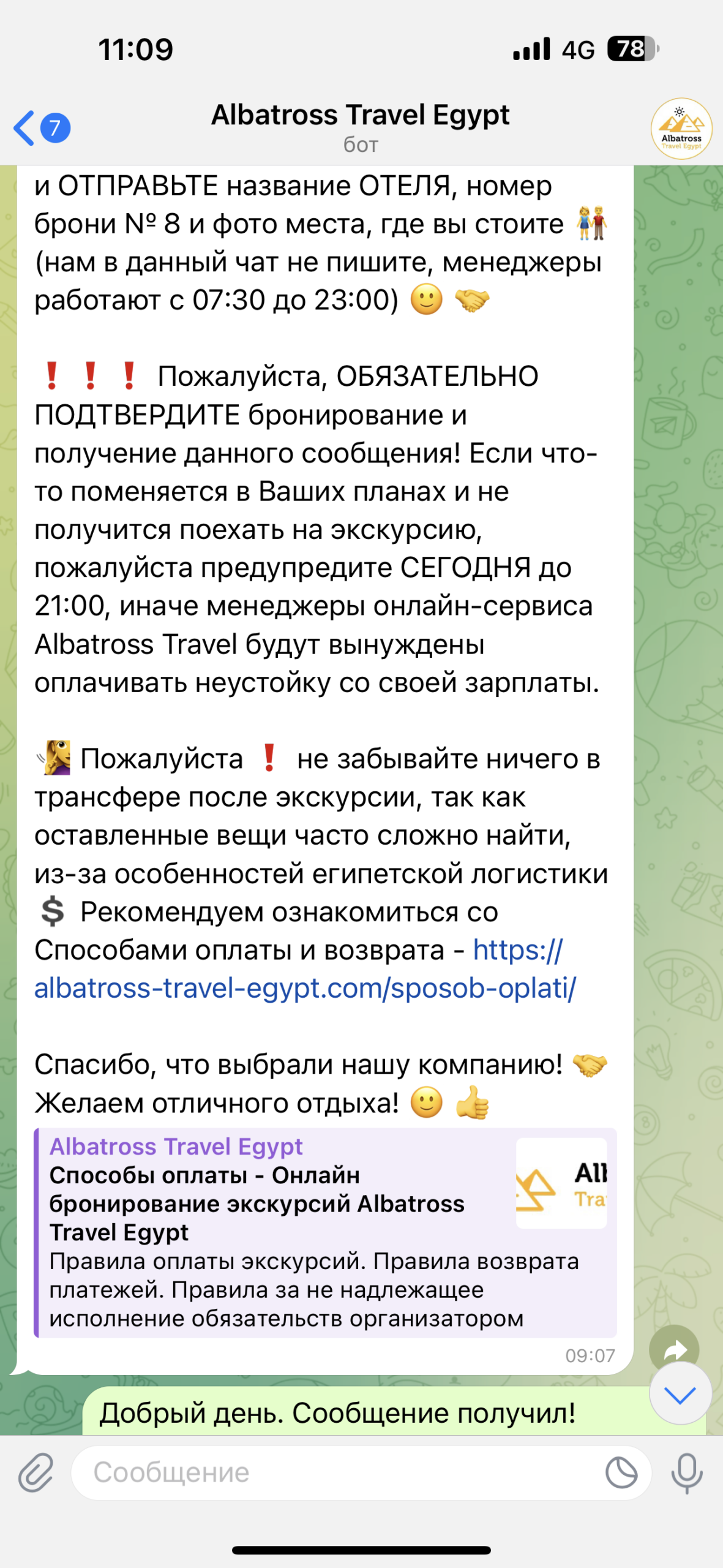 Хотели бы проинформировать, что мы не организаторы экскурсий, а являемся онлайн-сервисом по бронированию и сопровождению туристов, обеспечивая удобный способ заказа и выгодные условия. Более подробно с принципами нашей работы можно ознакомиться на странице: https://albatross-travel-egypt.com/o-kompanii/, если не сделали этого ранее. Данная информация всегда направляется каждому нашему туристу при бронировании.