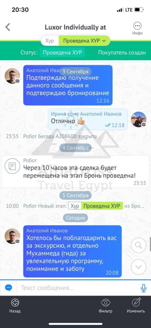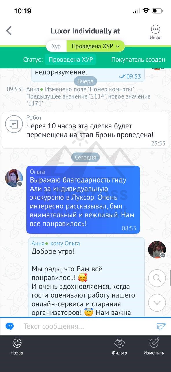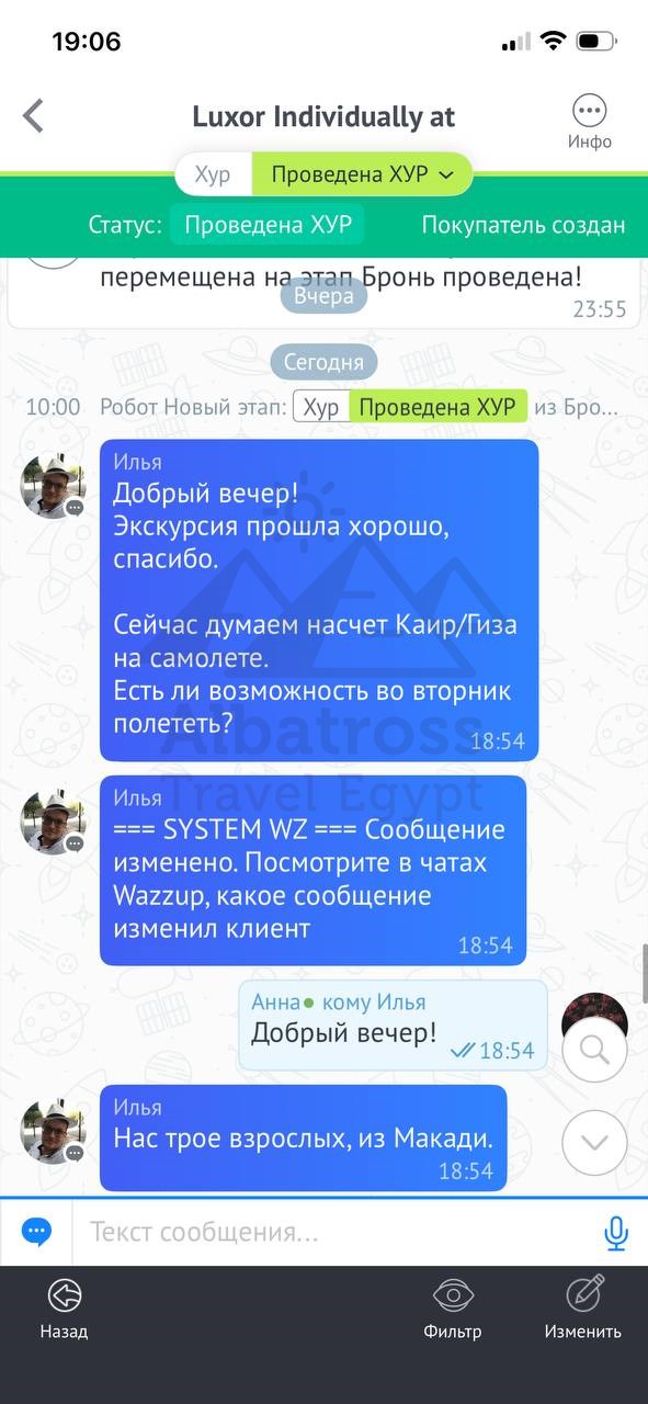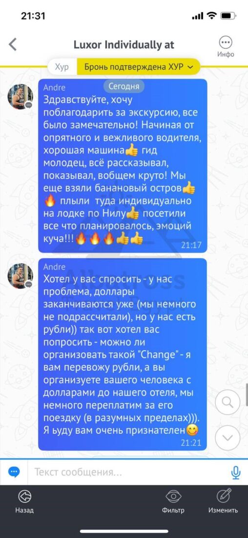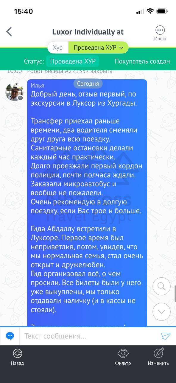 Здравствуйте, хочу поблагодарить за экскурсию, все было замечательно! Начиная от опрятного и вежливого водителя, хорошая машина гид молодец, всё рассказывал, показывал, вобщем круто! Мы еще взяли банановый остров плыли туда индивидуально на лодке по Нилу посетили все что планировалось, эмоций куча!!!