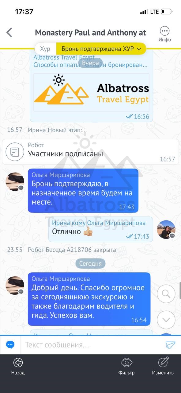 Спасибо большое за сегодняшнюю поездку в Монастыри, это одна из лучших моих поездок по Египту. Бесконечно Вам благодарна за организацию, гида Баха и водителя (забыла вроде Ахмед).