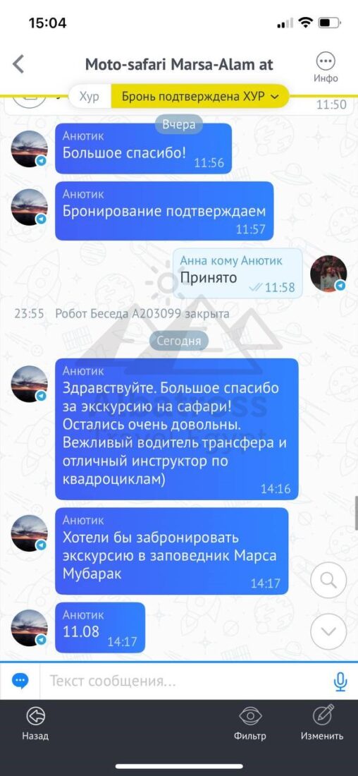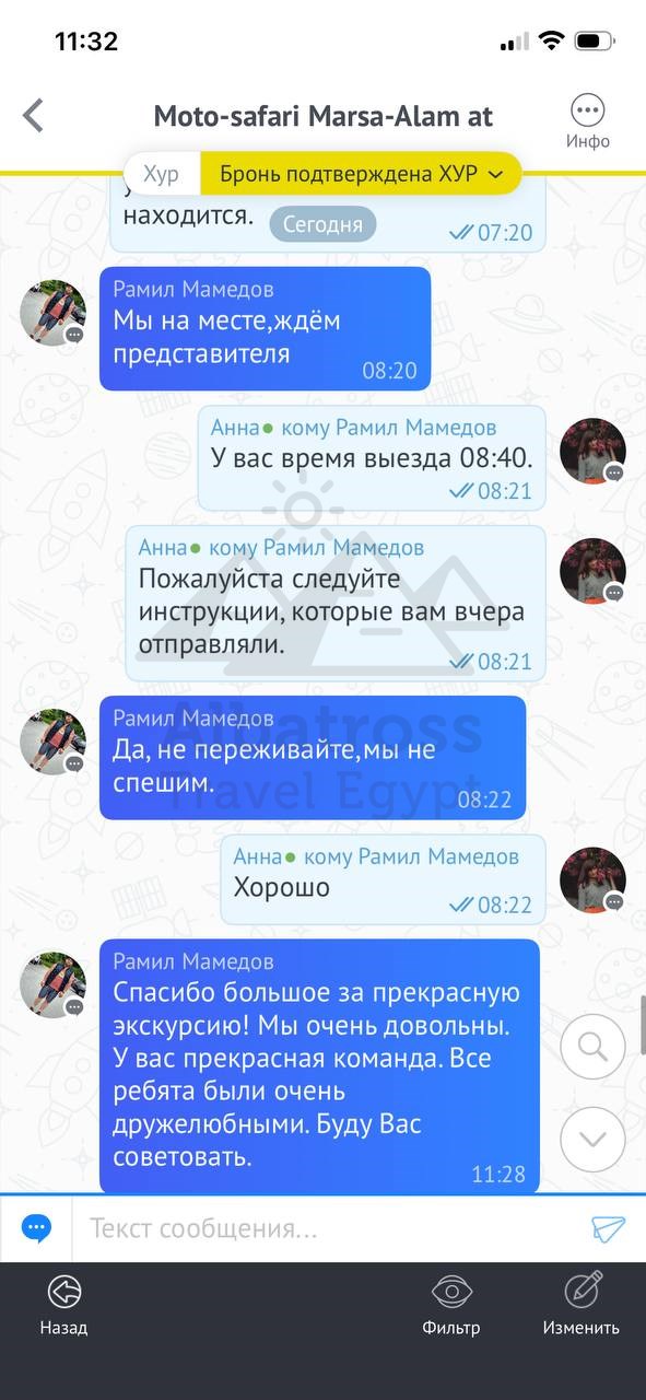 Добрый день! Экскурсией мото сафари мы с дочкой очень довольны, много позитивных эмоций и впечатлений. Я могла бы, конечно, покомандовать вас своим знакомым и также воспользоваться вашими услугами обязательно еще раз при повторном посещении Египта.