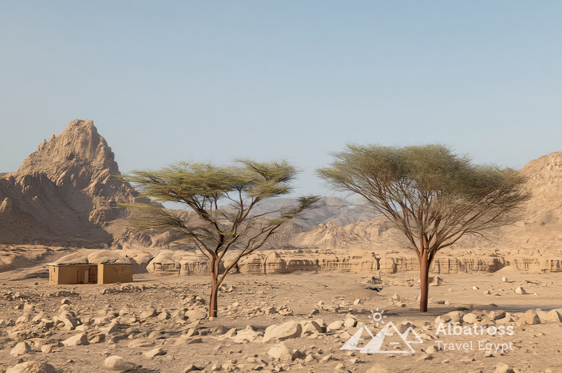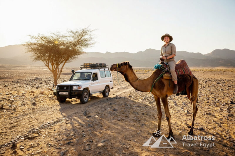 Ваше приключение начнется с комфортного трансфера из отеля в Хургаде. Всего примерно через 60 минут, в зависимости от вашего местоположения, вы окажетесь в сердце пустыни. Первая остановка — настоящий дом шейха бедуинской семьи. Здесь вы познакомитесь с традициями и бытом бедуинов, попробуете ароматный бедуинский чай и даже сможете прокатиться на верблюдах.