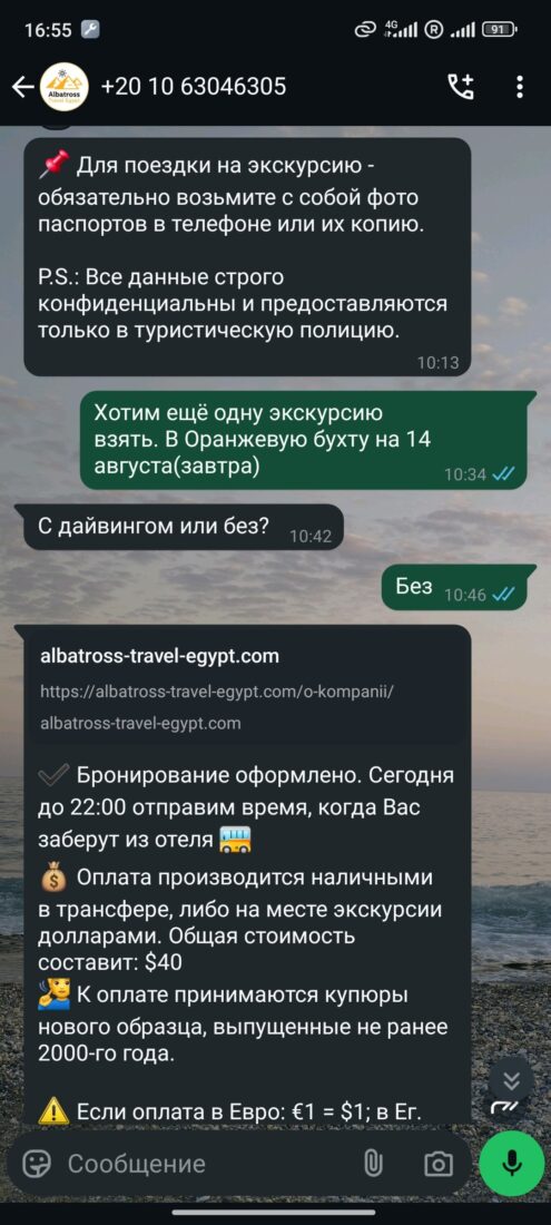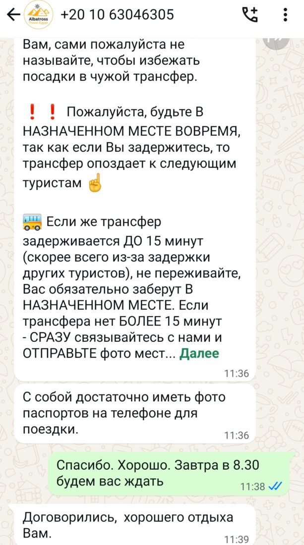 Ещё раз спасибо за обратную связь. Именно благодаря этому мы все вместе с нашими туристами влияем на качество сервиса экскурсий у организаторов и способствуем улучшение туристического бизнеса в Египте в целом.