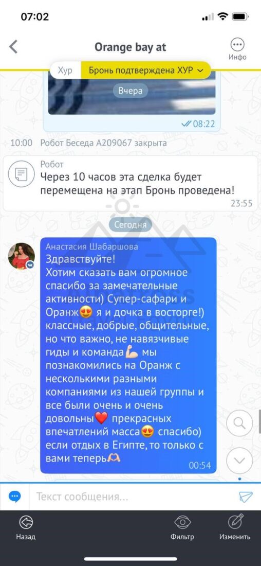 Хотим сказать вам огромное спасибо за замечательные активности) Супер-сафари и Оранж я и дочка в восторге!) классные, добрые, общительные, но что важно, не навязчивые гиды и команда мы познакомились на Оранж с несколькими разными компаниями из нашей группы и все были очень и очень довольны прекрасных впечатлений масса спасибо) если отдых в Египте, то только с вами теперь