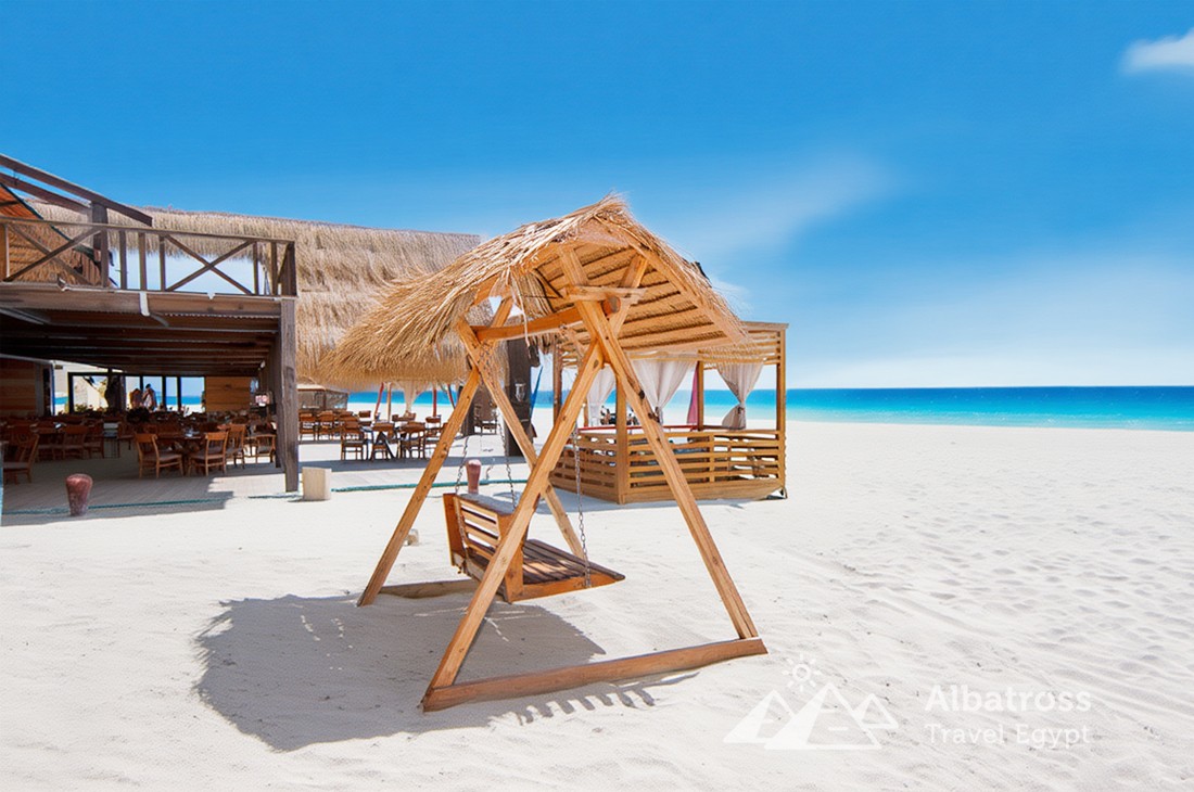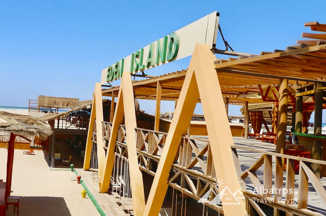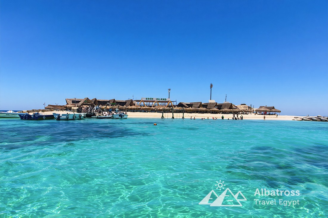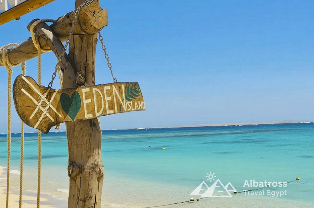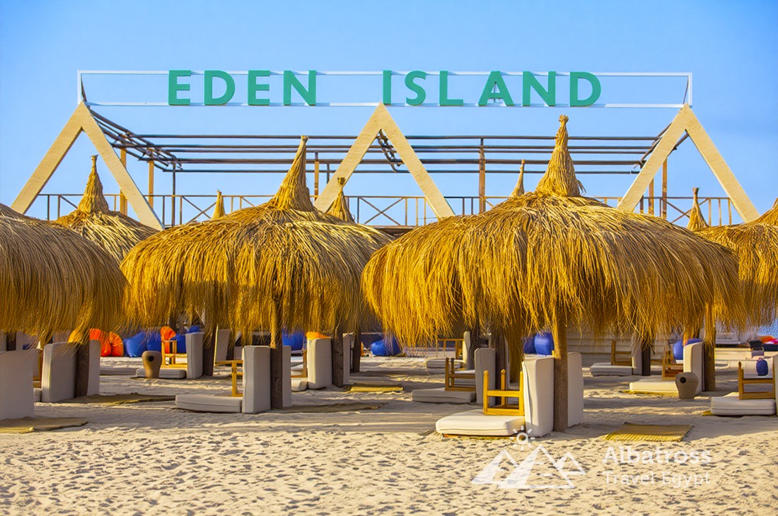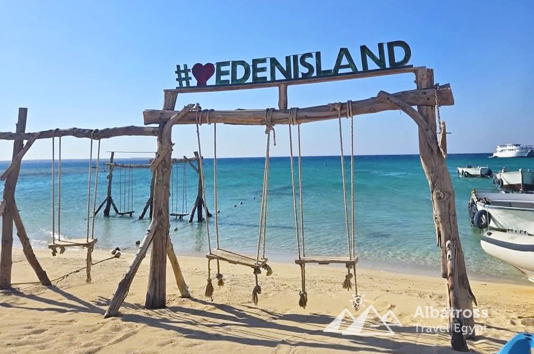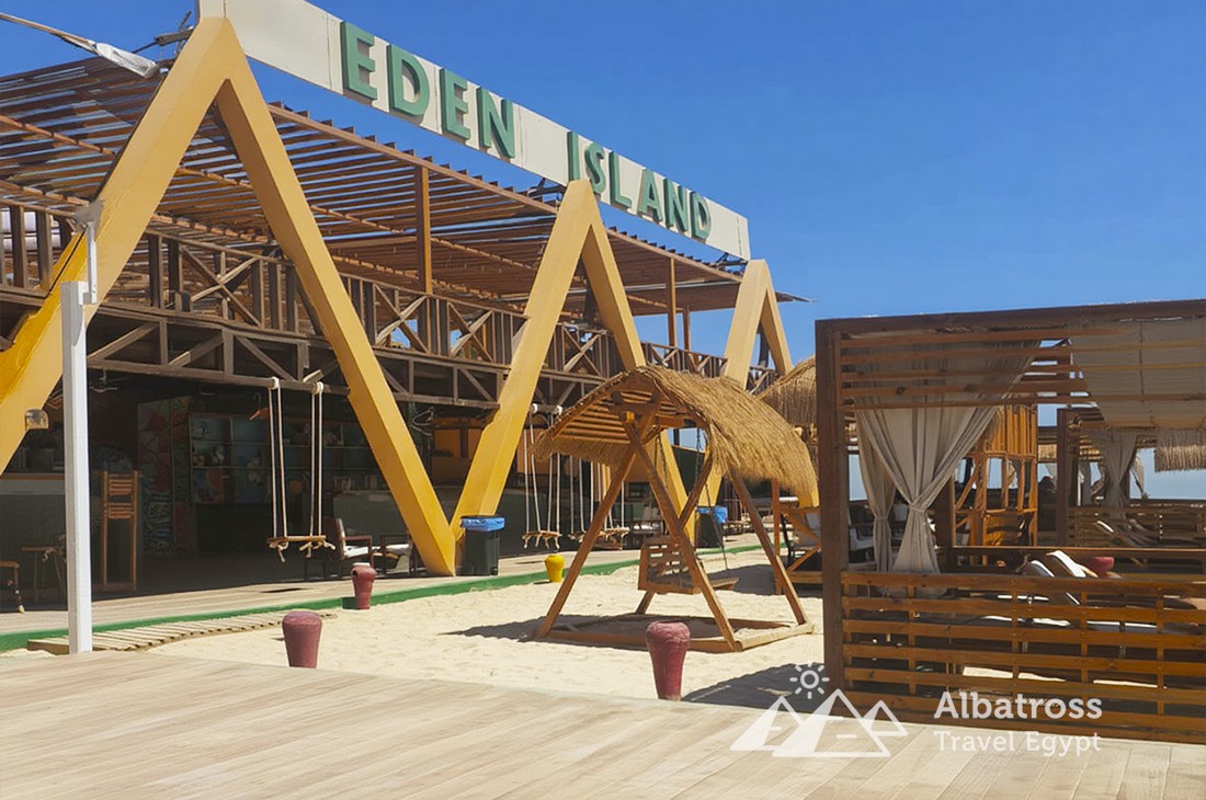 Остров Эден называют «Египетскими Карибами» за белоснежный песок, прозрачную бирюзовую воду и невероятный подводный мир. Здесь, вдали от суеты, гостей ждёт шикарный пляж с шезлонгами, гамаками, теневыми зонами и качелями на воде, а также множество возможностей для фотосессий, спуска под воду с маской и просто тихого семейного отдыха.