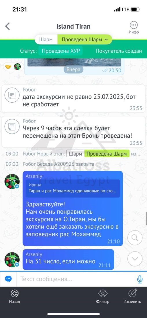 Нам очень понравилась экскурсия на О.Тиран, мы бы хотели ещё заказать экскурсию в заповедник рас Мохаммед
