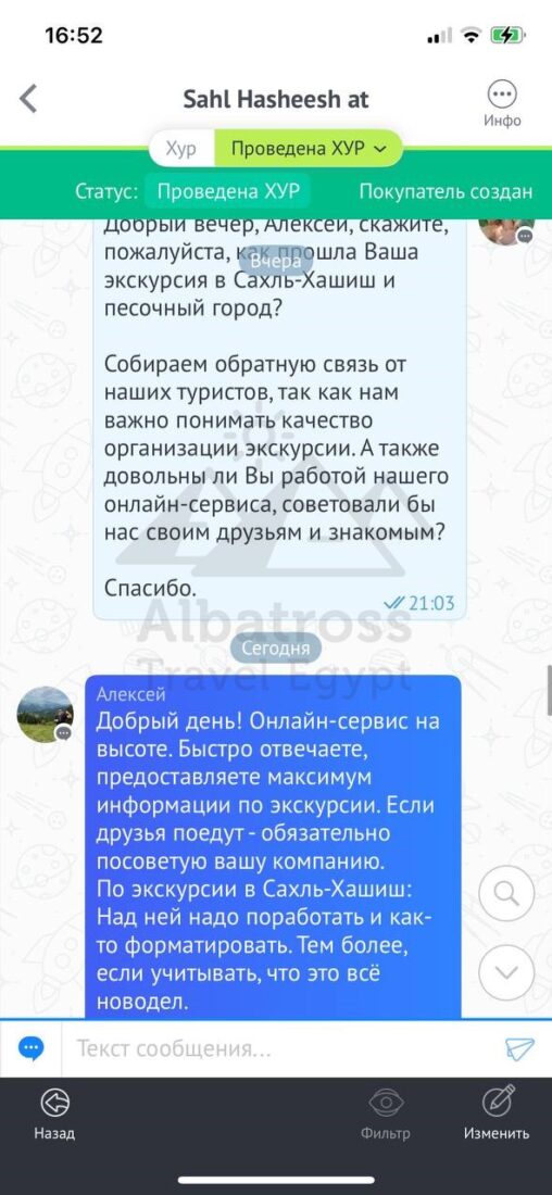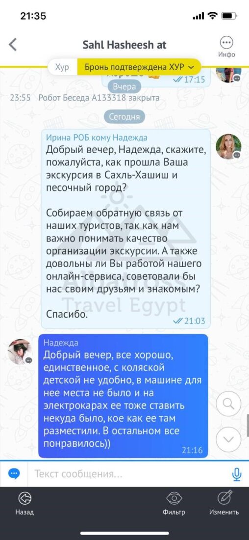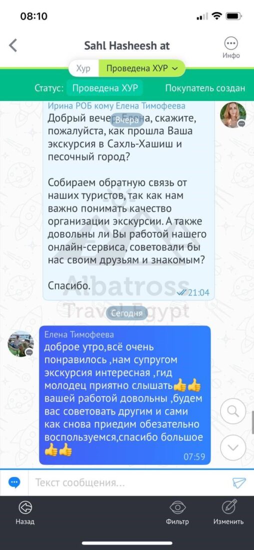 Добрый день! Онлайн-сервис на высоте. Быстро отвечаете, предоставляете максимум информации по экскурсии. Если друзья поедут — обязательно посоветую вашу компанию.