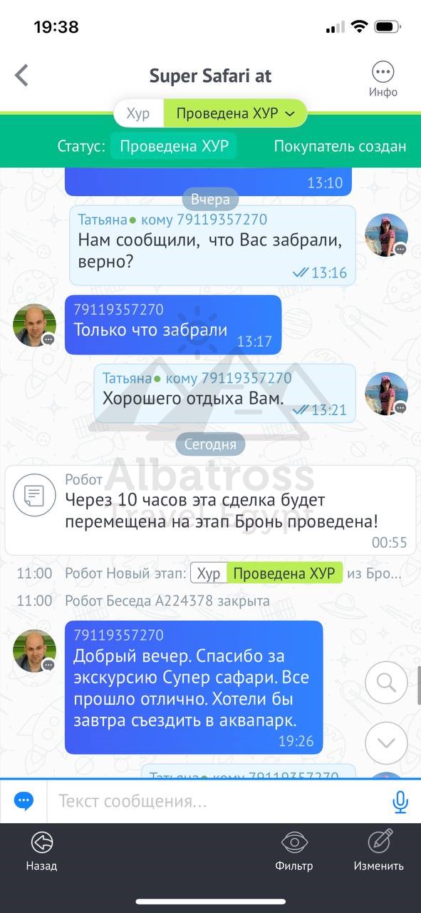 Добрый вечер. Спасибо за экскурсию Супер сафари. Все прошло отлично. Хотели бы завтра съездить в аквапарк.