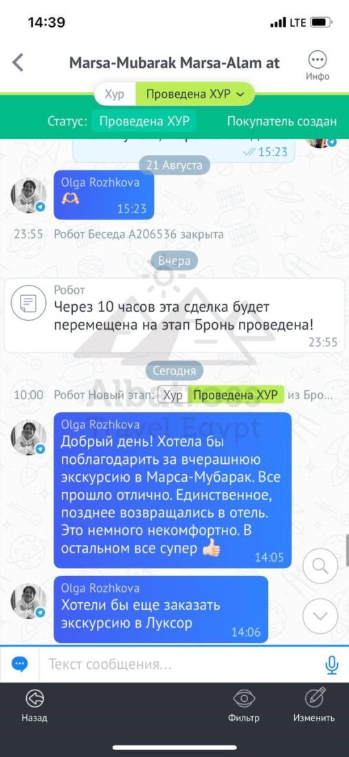 Добрый день! Хотела бы поблагодарить за вчерашнюю экскурсию в Марса-Мубарак. Все прошло отлично. Единственное, позднее возвращались в отель. Это немного некомфортно. В остальном все супер