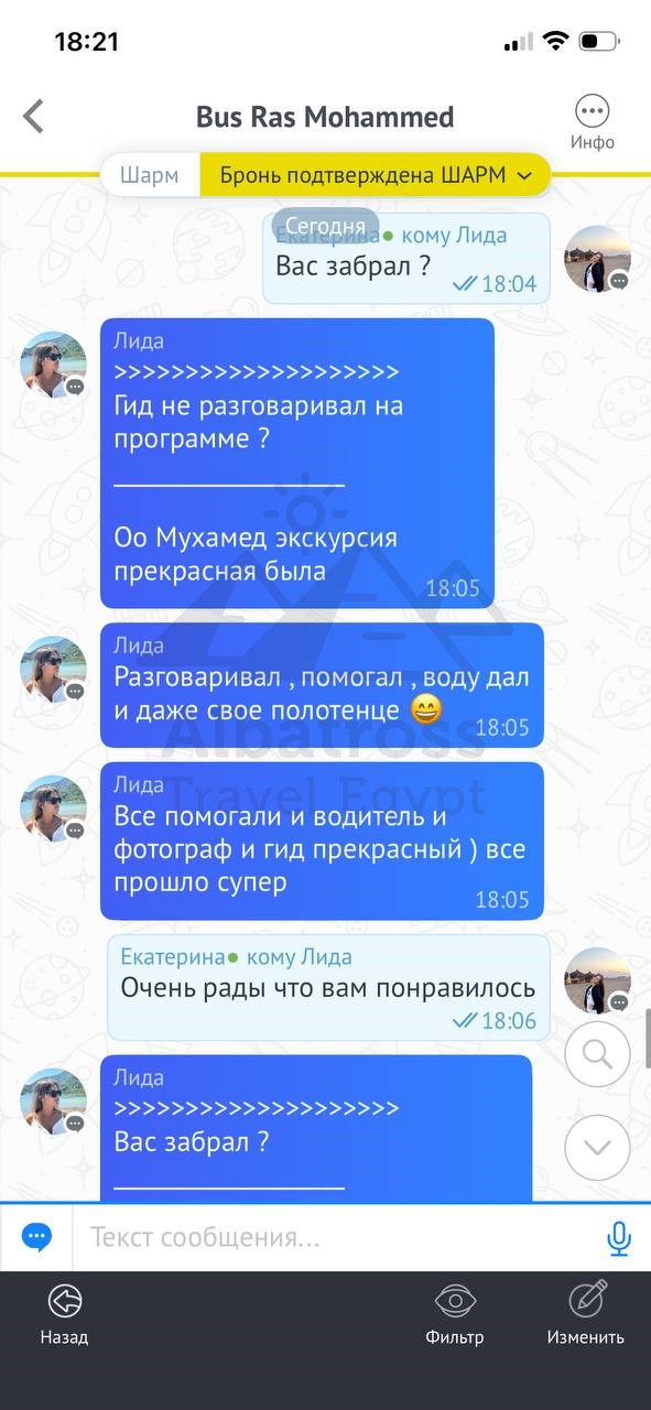 Добрый вечер, хотела бы поблагодарить всю вашу команду!!! Вы огромные молодцы!!! Вы делаете отпуск людей еще краше!!! Мы были с Вами на трех экскурсиях и все прошли на высшем уровне, без внимания ни кто не остался!!! Спасибо огромное!!! Будем обязательно прилетать в Египет и пользоваться только Вашими услугами